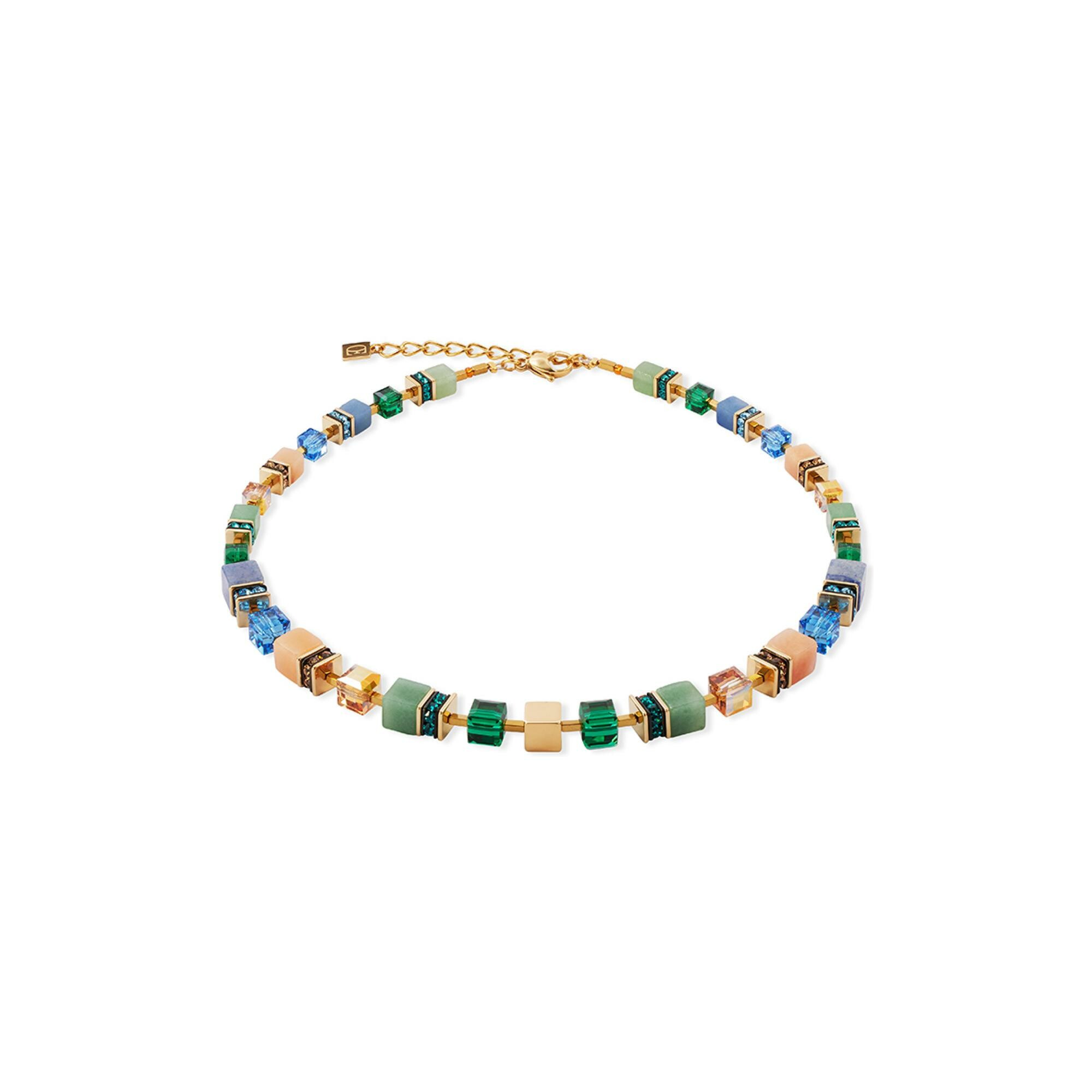 Collier Coeur de Lion GeoCUBE Precious Statement en acier doré, aventurine rosé, aventurine verte et aventurine bleu, cristaux Swarovski et strass Description détaillée